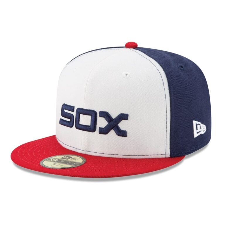 Get geared up with New Era’s AC Collection cap for the Chicago White Sox. This is the official Major League Baseball on-field Alternate Alt hat worn by White Sox players and engineered for victory. This is also called the White Sox Sunday cap as the team often wears this cap for Sunday games. A 5950 fitted hat, with a standard New Era structured high crown and a flat visor, this cap is Navy and White with a Red visor, with a Navy raised 3D embroidery White Sox front logo, a White MLB Batterman back logo. This hat is made from New Era performance fabric, offering shrink resistance, moisture wicking and UPF50 sun protection. This is a 100% polyester hat.
