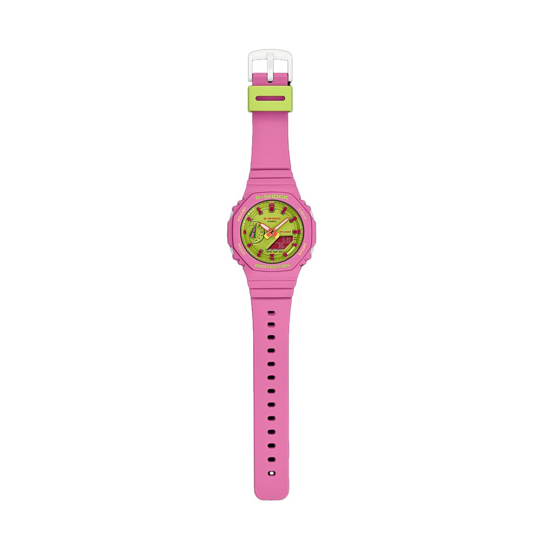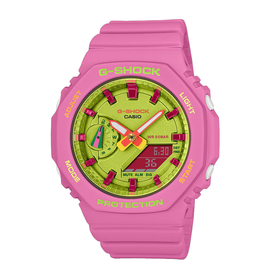 Brighten up your summer days with some vibrant G-SHOCK color. The GMAS2100 features a flat dial and simple bar indexes, each of the components bringing a different color to your fun and festive celebration of the sunniest time of year.