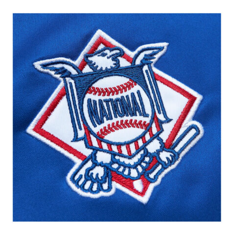 Satin varsity style jacket by Mitchell & Ness topped with Los Angeles Dodgers logo embroidery. Fitted with a snap closure front. Includes side hand pockets and striped ribbed knit trims.