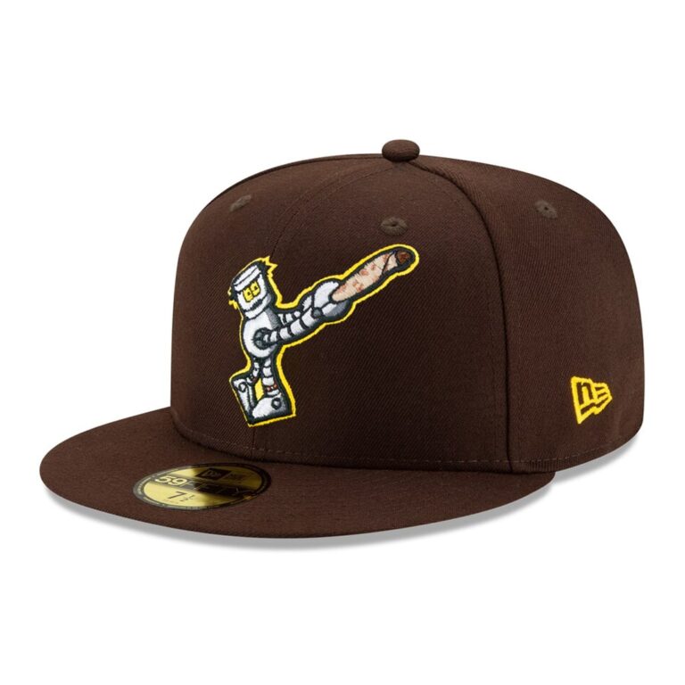 Dionic X Billion Creation Robot Friar New Era 59FIFTY Fitted Hat. The Robot is an iconic Dionic design, which we took and made it our own by having him in the same position as the Padres Swinging Friar logo. The front of this hat features the Dionic Robot swinging a burrito. Back logo is the Dionic brand logo. Colorway of this hat is burnt wood brown and gold yellow, the same colorway as the official Padres on field Game hat and uniform. Undervisor is black. Dionic is one of the preeminent designers for fitted hats, having collaborated with Hat Club, Brandiose and now Billion Creation. The Robot Friar is a Billion Creation exclusive design. Â