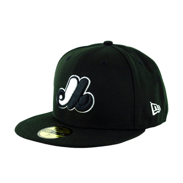 Get geared up with this custom colorway cap for the Montreal Expos. This hat is Black with a Black and White 3-D raised embroidery front M with a White outline. NE flag side logo comes in White and the MLB Batterman in back is White. Standard New Era 5950 fit, with a structured high crown and a flat visor. This is a 100% polyester hat.