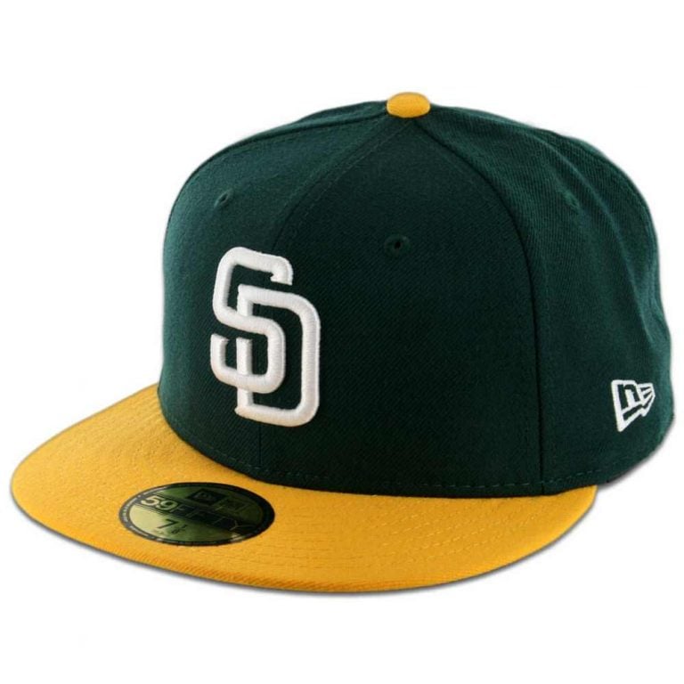 Get geared up with this custom colorway cap for the San Diego Padres. This hat is Dark Green with a White 3-D raised embroidery front SD. This is a two tone cap with a Gold visor. NE flag side logo comes in White and the MLB Batterman in back is White. Standard New Era 5950 fit, with a structured high crown and a flat visor. This is a 100% wool hat. Â