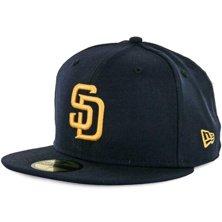 Get geared up with this custom colorway cap for the San Diego Padres. This hat is Dark Navy with a Gold 3-D raised embroidery front SD. NE flag side logo comes in Gold and the MLB Batterman in back is Gold. Standard New Era 5950 fit, with a structured high crown and a flat visor. This is a 100% polyester hat. Â