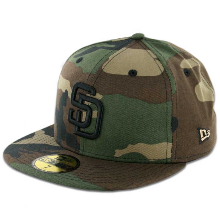 Get geared up with this custom colorway cap for the San Diego Padres. This hat is Woodland Camo with a Black 3-D raised embroidery front SD. NE flag side logo comes in Black and the MLB Batterman in back is Black. Standard New Era 5950 fit, with a structured high crown and a flat visor. This is a 100% polyester hat. Â