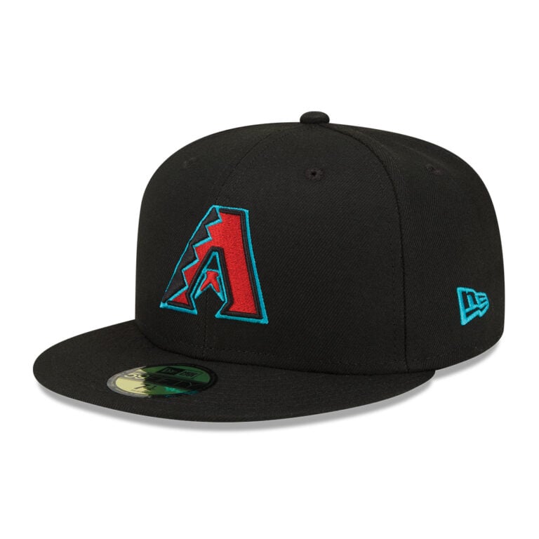 Get geared up with New Era’s AC Collection cap for the Arizona Diamondbacks. This is the official Major League Baseball on-field Alternate Alt hat worn by Diamondbacks players and engineered for victory. A 5950 fitted hat, with a standard New Era structured high crown and a flat visor, this cap is Black, with a Red, White and Teal raised 3D embroidery Diamondbacks front logo outlined With Black and Teal, a White MLB Batterman back logo, and a Teal New Era NE flag logo on the left side. This hat is made from New Era performance fabric, offering shrink resistance, moisture wicking and UPF50 sun protection. This is a 100% polyester hat.