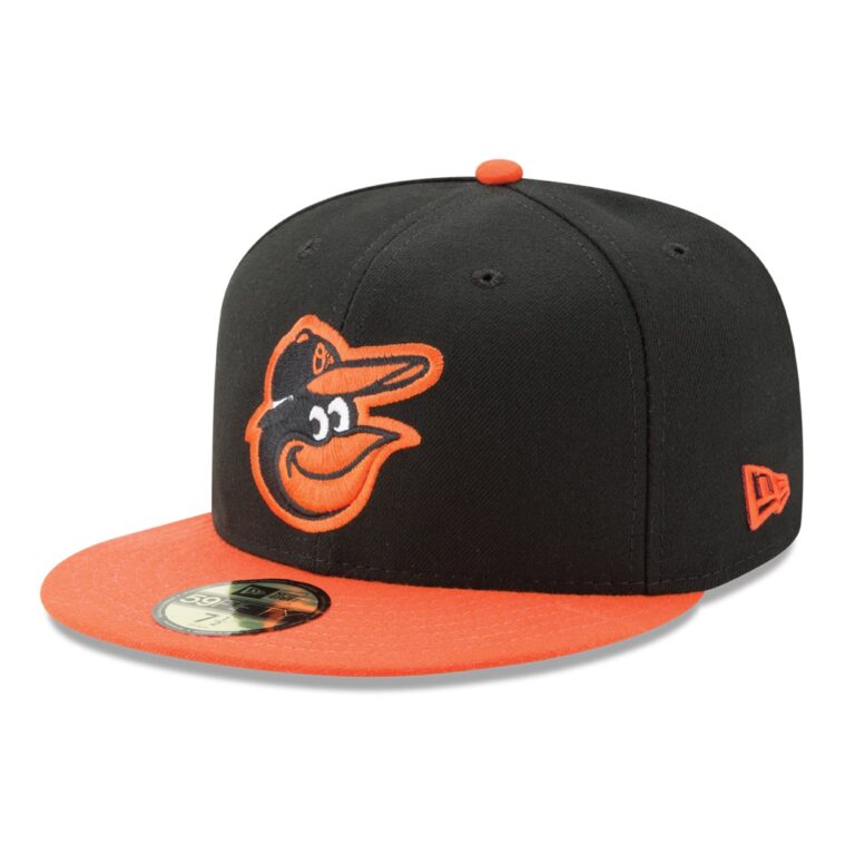 Get geared up with New Era’s AC Collection cap for the Baltimore Orioles. This is the official Major League Baseball on-field Road Away hat worn by Orioles players and engineered for victory. A 5950 fitted hat, with a standard New Era structured high crown and a flat visor, This is a Two-Tone hat with a Black crown and an Orange visor, with a Black and Orange 3D embroidery Orioles front logo outlined with Orange, a White MLB Batterman back logo, and an Orange New Era NE flag logo on the left side. This hat is made from New Era performance fabric, offering shrink resistance, moisture wicking and UPF50 sun protection. This is a 100% polyester hat.