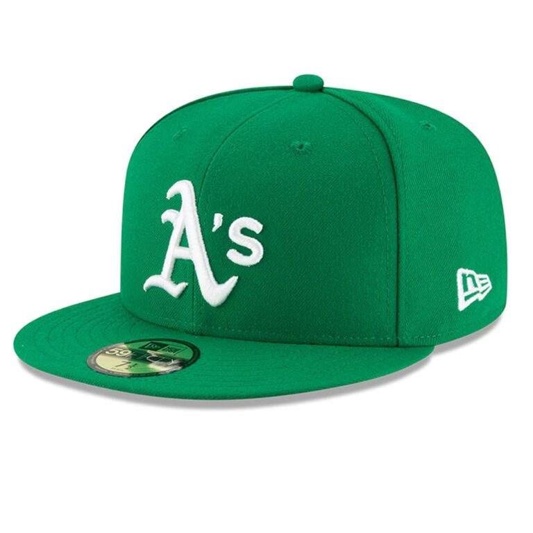 Get geared up with New Era’s AC Collection cap for the Oakland Athletics. This is the official Major League Baseball on-field Alternate Alt hat worn by Athletics players and engineered for victory. A 5950 fitted hat, with a standard New Era structured high crown and a flat visor, this cap is Kelly Green, with a White raised 3D embroidery Athletics front logo, a White MLB Batterman back logo, and a White New Era NE flag logo on the left side. This hat is made from New Era performance fabric, offering shrink resistance, moisture wicking and UPF50 sun protection. This is a 100% polyester hat.