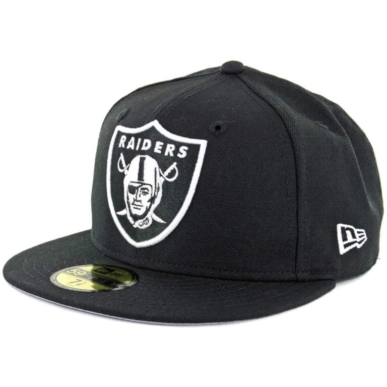 Get geared up with this custom colorway cap for the Las Vegas Raiders. Formerly the Oakland Raiders, this hat is Black with a White 3-D raised embroidery front Raider with a White outline. NE flag side logo comes in White and the NFL Shield in back is White. Standard New Era 5950 fit, with a structured high crown and a flat visor.