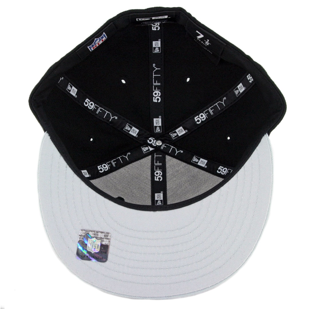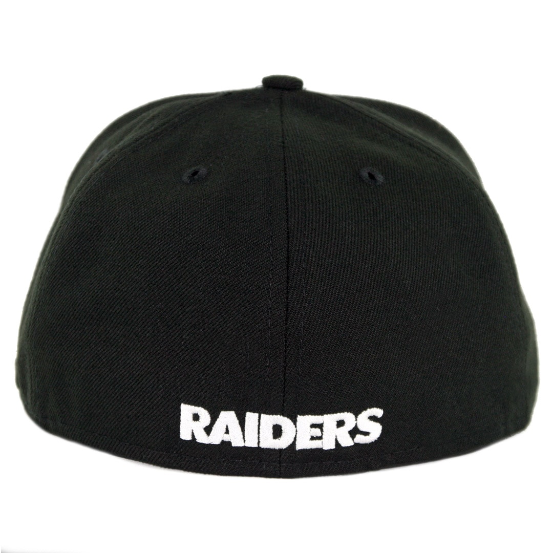 Get geared up with this custom colorway cap for the Oakland Raiders. This hat is Black with a Official Team Colors 3-D raised embroidery front Raider with a White outline. This is a two tone cap with a Light Grey visor. NE flag side logo comes in White and the Raider script in back is White. Standard New Era 5950 fit, with a structured high crown and a flat visor. This is a 100% wool hat.
