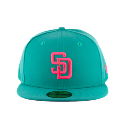 This is an official SD Padres 5950 fitted hat. This is a Billion Creation version of the original Padres City Connect style, done with updated colors clear mint and pink glow.