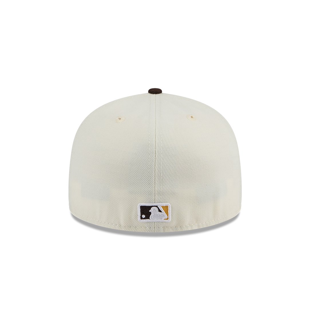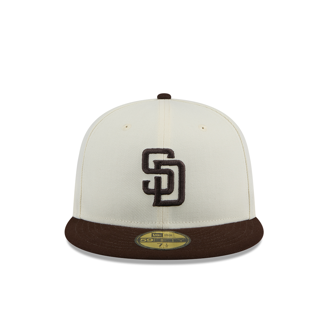 Support the Padres with a unique and stylish look with the New Era 59Fifty San Diego Padres Evergreen Fitted Hat in Chrome White and Brown. This fitted cap offers a distinctive take on team colors.