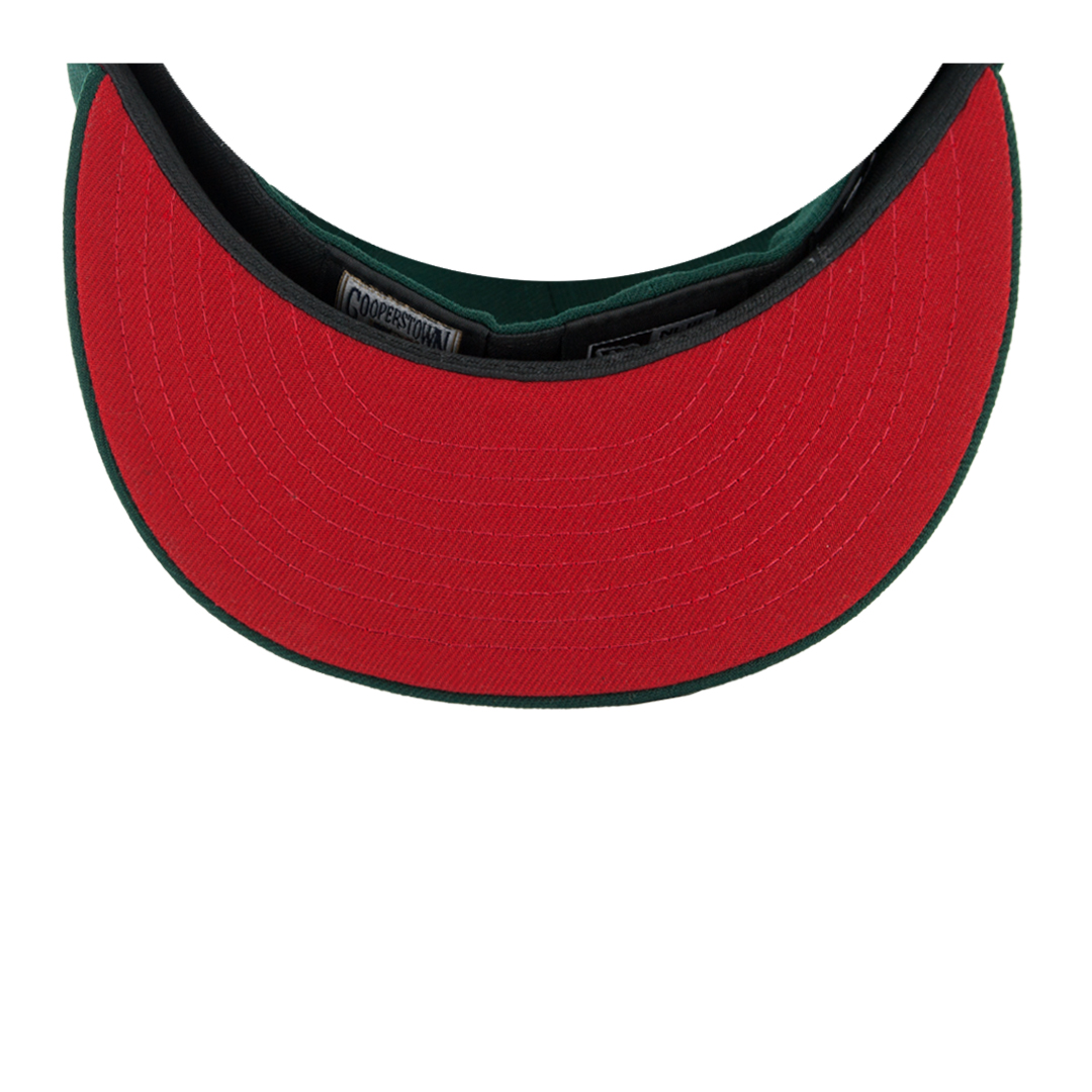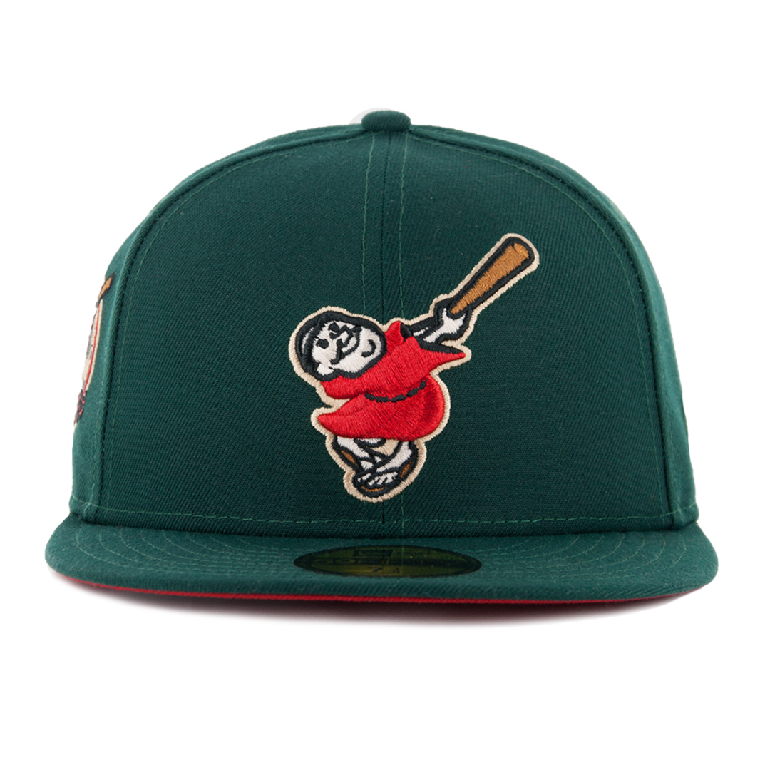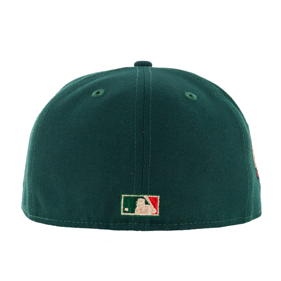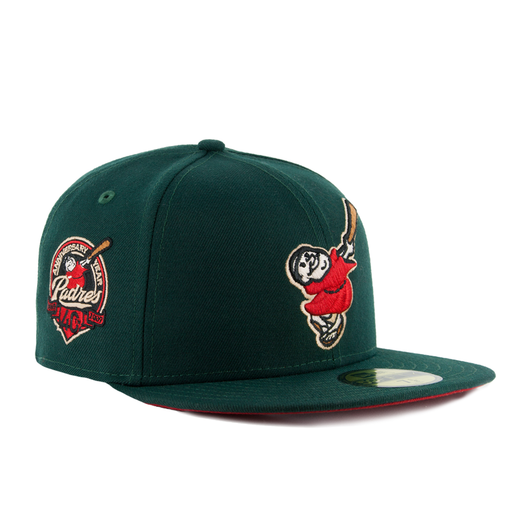 Representing the culmination of style and swag, we give you the New Era 5950 San Diego Padres Friar Meridian fitted cap re-release! This cap was originally created by Exclusive Fitted and we loved the design so much we picked it up, with their approval, for relaunch. Hats off to Exclusive Fitted! This is a dark green cap with a red swinging friar logo on the front. 40th Anniversary side patch on right side done in electric lime green with red. Undervisor is a matching scarlet red.