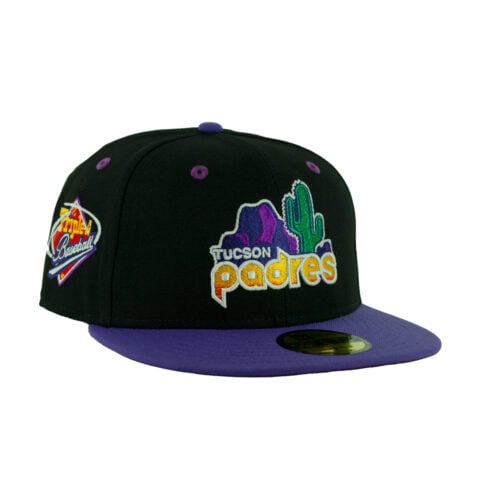 This hat is a Tucson Padres Sunset Collection 5950 fitted cap. The front is a gradient Tucson Padres logo. Triple-A side patch is done in sunset hues. Visor is a brighter varsity purple that changes on the UV to a deep purple. Crown of this hat is black as the night sky.