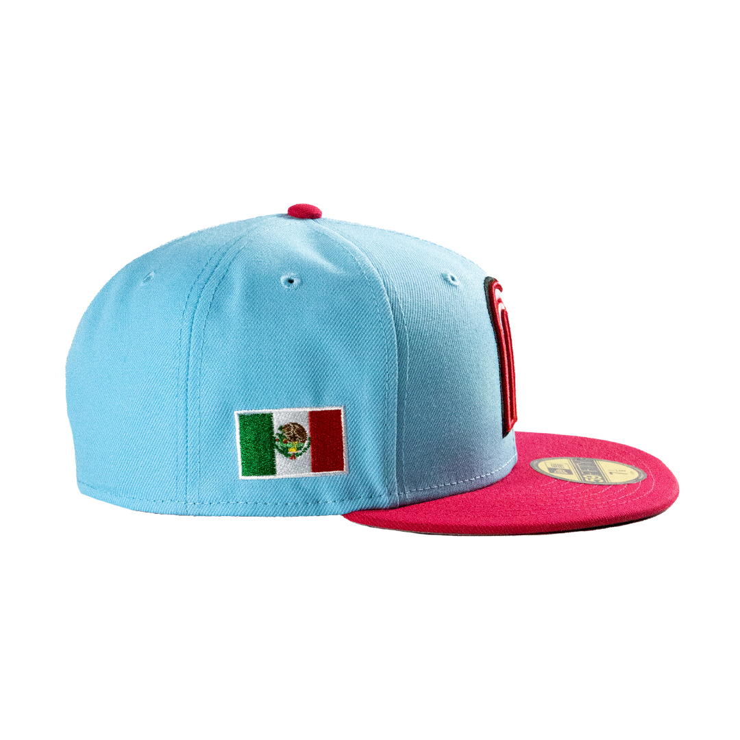 New Era 59Fifty official licensed World Baseball Classic Hat. This is the Mexico National Baseball Team On Field Alt hat. Doscientos blue crown, pink visor and gray undervisor. Front logo is Mexico M logo. Mexico Flag side patch and WBC logo embroidered on back.