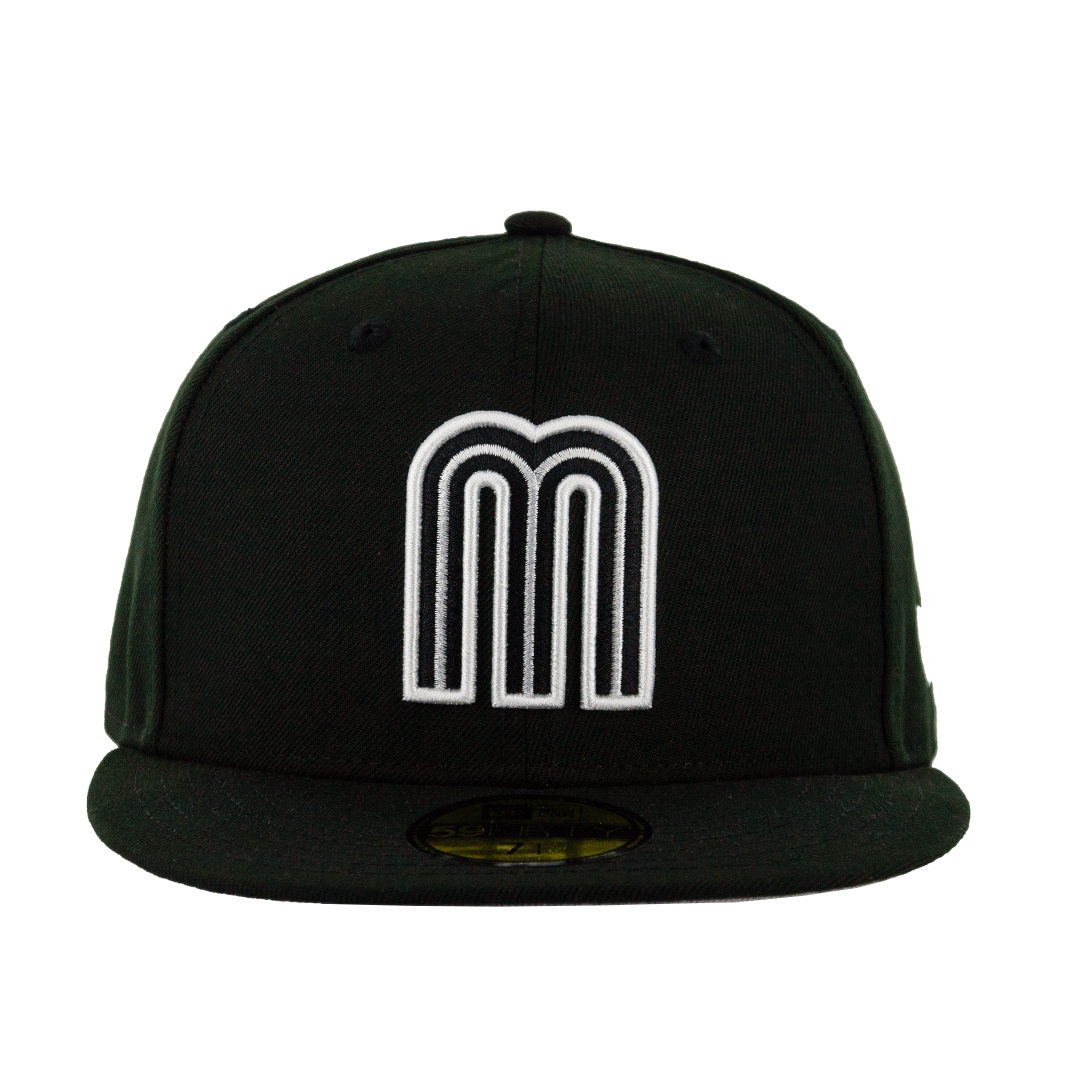 New Era 59Fifty Mexico WBC National Baseball Team hat. Black crown with a gray undervisor. Mexico WBC M logo embroidered on front in white. MEXICO word logo embroidered in back in white.