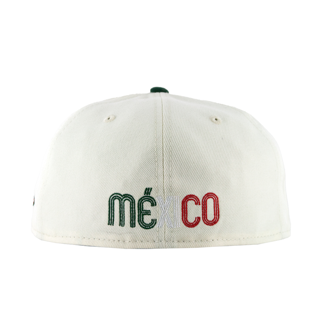 New Era 59Fifty Mexico WBC National Baseball Team hat. Chrome white crown, Dark green visor and scarlet red undervisor. Mexico WBC M logo embroidered on front in white, dark green, and red. Mexico Flag side patch and MEXICO embroidered on back.