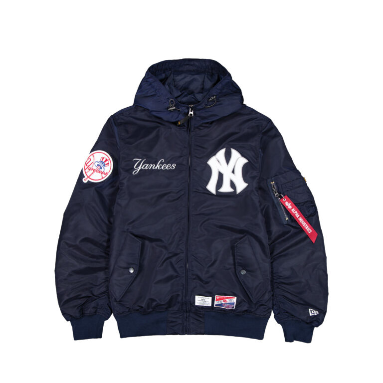 New Era x Alpha Industries Full-Zip Hooded Nylon Bomber Parka Jacket. This jacket provides a stylish aesthetic while showing off game-ready New York Yankees graphics.
