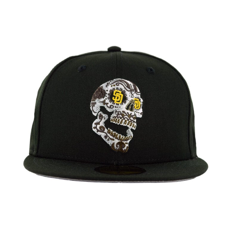 Taking inspiration from our popular Padres Sugar Skull Brown Fitted Hat, Padres Sugar Skull Gwynn Dark Navy Fitted Hat, and Padres Sugar Skull Black Adjustable Snapback Hat, we bring you the Padres Flying Skull. This is a New Era 5950 fitted cap with a black crown and black brim. The front logo is an original design first done here at Billion Creation with a Sugar Skull meets Ghostrider vibe. 1998 World Series side patch on right side with a gray undervisor to complete the look.