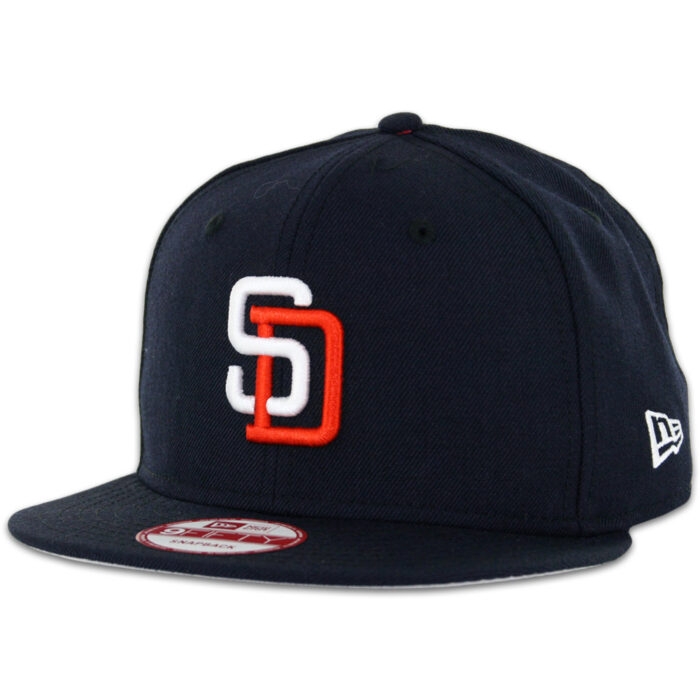 This hat is a New Era San Diego Padres 9FIFTY Snapback. This New Era San Diego Padres Snapback hat is done in the classic San Diego Padres 1998 season color way. It has the iconic white and orange SD logo on a dark navy hat. The back has “padres” written in the old school San Diego Padres font. This hat is 100% wool. This hat is also 100% 1904 so you know what city you rep when you wear this.