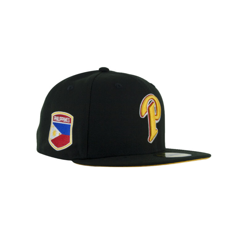 Billion Creation x Rally Caps San Diego Padres Philippines P Logo celebrates the rich cultural heritage brought by our Filipino community here in San Diego. This is burnt wood brown and gold yellow SD hat. Front logo is the Padres P logo in gold yellow with a red outline and white drop shadow. Philippines flag crest side patch with traditional red, white, blue and gold. NE and MLB Batterman logo are also done in red, white, blue, and gold. This is a New Era 5950 fitted cap.
